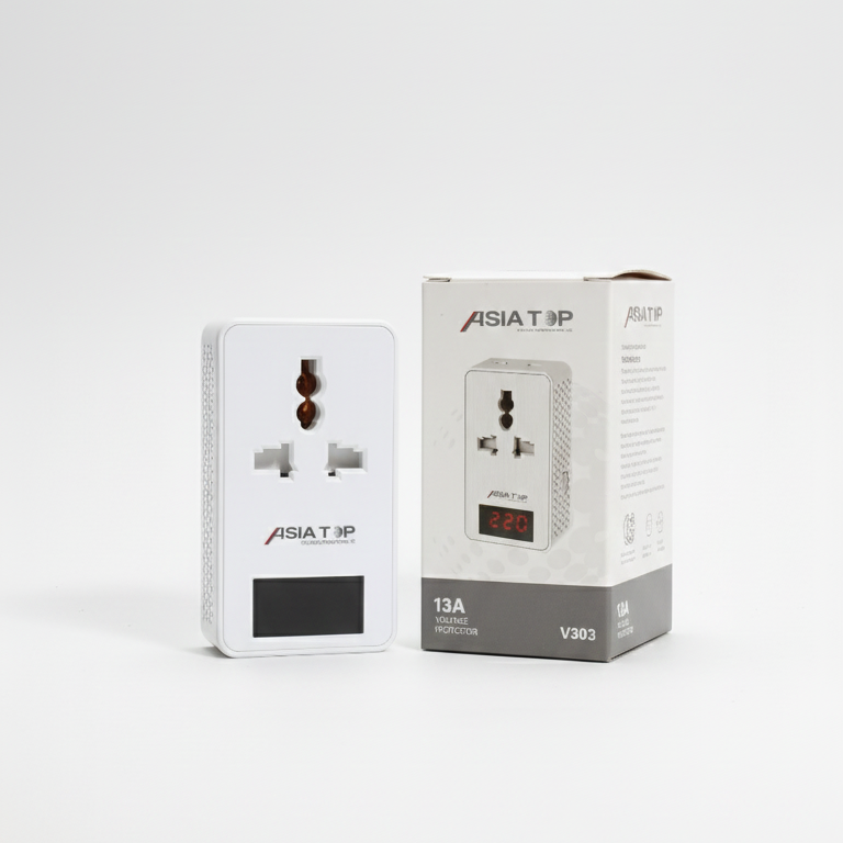 Operating on 220VAC with 13A current capacity, the Asia Top V303 features intelligent adjustable delay times (5 seconds / 180 seconds) to stabilize power before reconnecting. Its wide operating temperature range and compact design make it ideal for daily use in homes, shops, and offices.