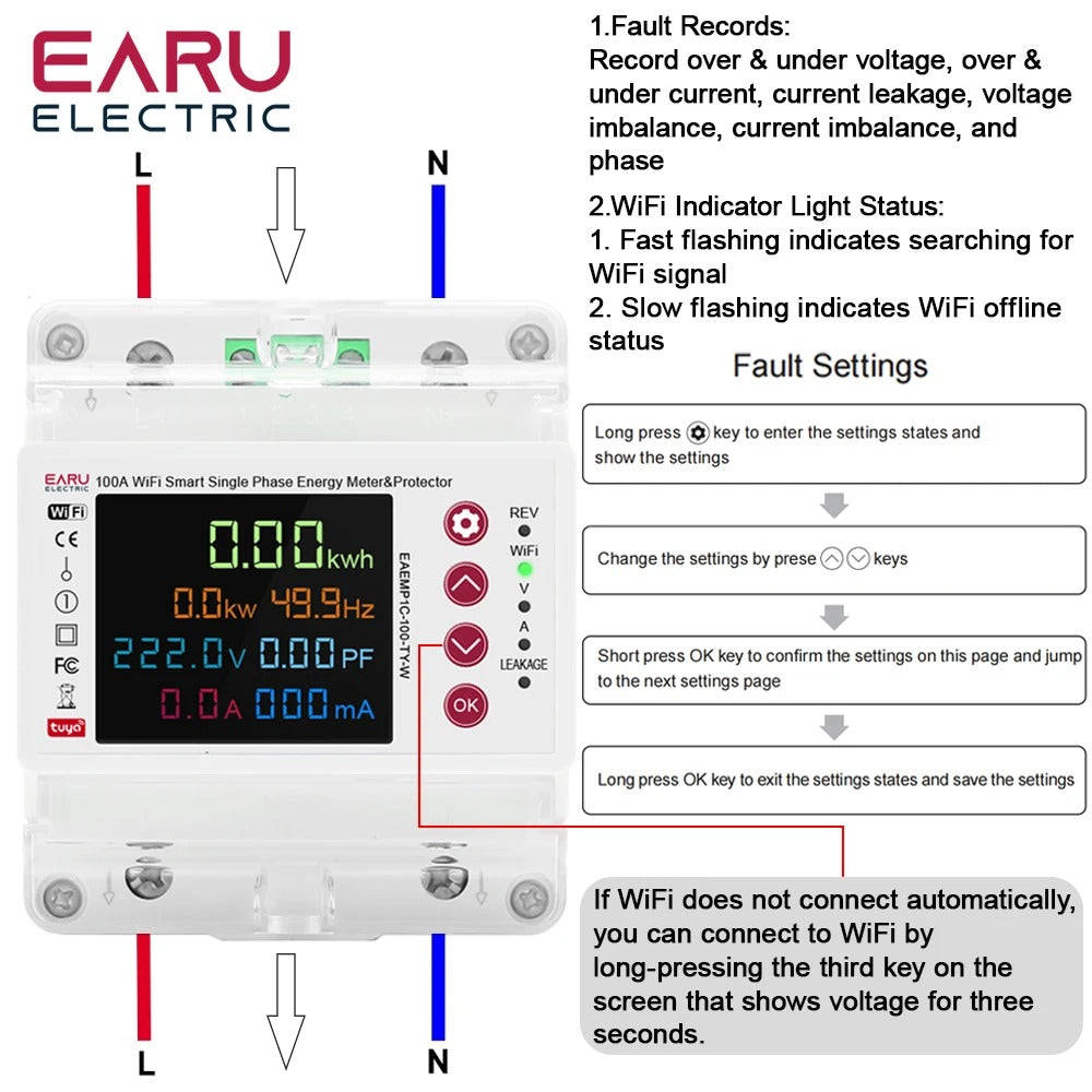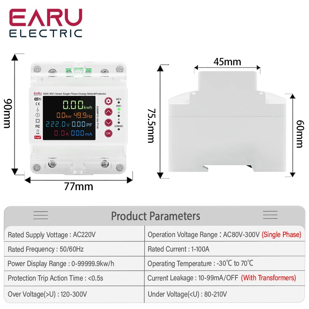 EARU 100A WiFi Smart Single Phase Energy Meter & Protector – Tuya Smart / Smart Life Compatible