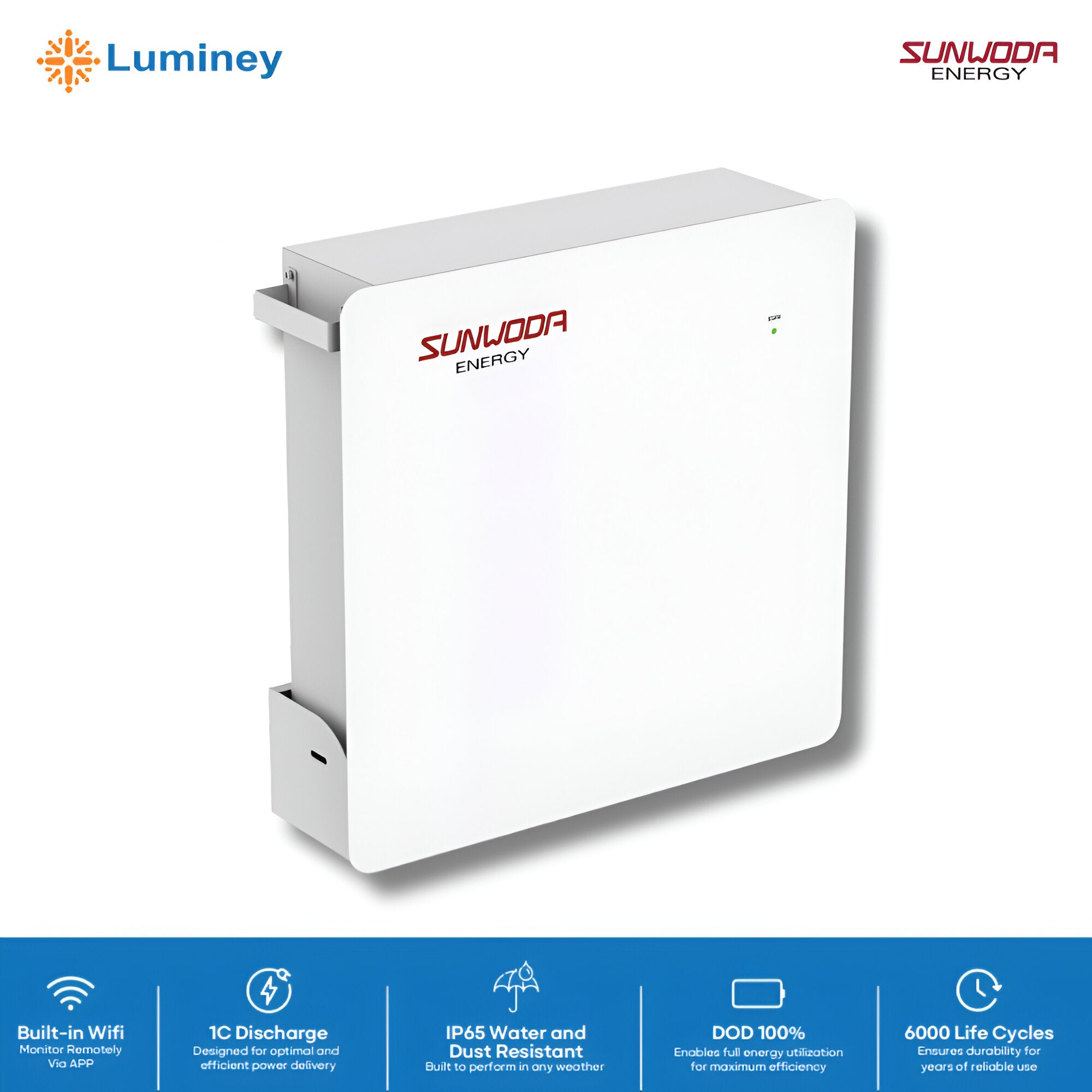 The Luminey MonaWall SE5 is a high-performance LiFePO4 battery designed for residential and commercial energy storage. With 6000 life cycles, 100% Depth of Discharge (DOD), and built-in WIFI monitoring, it ensures efficient and reliable energy storage. Its IP65 rating makes it suitable for both indoor and outdoor installation.